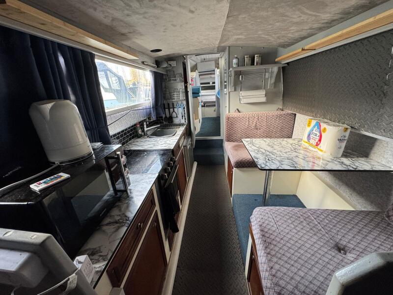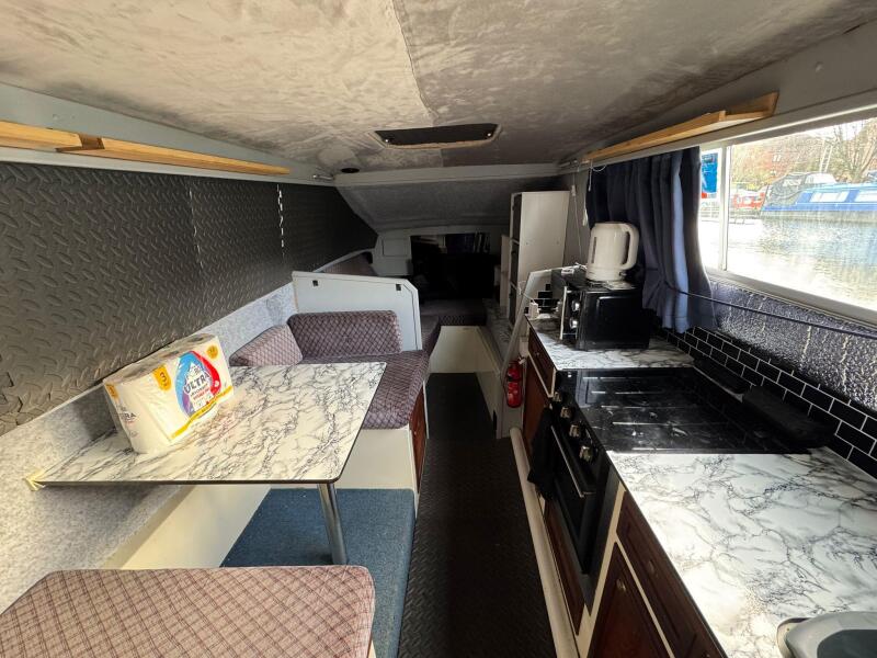 The galley is located on the starboard side and is well equipped, featuring a freestanding gas cooker with four-burner hob, grill and oven, a sink with drainer, and a 12v fridge. Opposite the galley is the dinette, which converts into an occasional double berth.