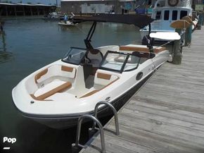 The boat also includes convenient storage compartments, a swim platform, and an integrated Bimini top for shade on sunny days.